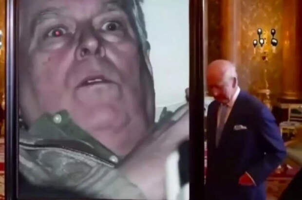 На кадрах британский король Карл III в Букингемском дворце торжественно открывает снимок, на котором изображен Эндрю после задержания.