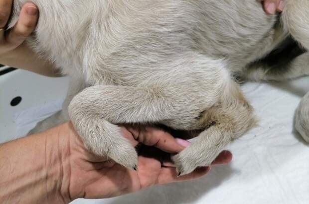 Во время отлова бездомных собак по заявке специалисты обнаружили, что один щенок не успевал за стаей. При ближайшем рассмотрении сотрудники приюта заметили, что у него имеется аномалия развития передней лапки.