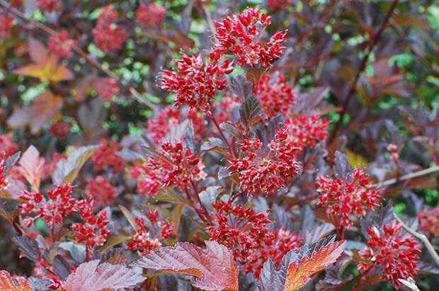 Самый неприхотливый кустарник с пурпурной листвой — пузыреплодник калинолистный. Наиболее известен его сорт ‘Diabolo’, чьи высокие (до 3 м) раскидистые кусты выглядят весьма впечатляюще, но требуют немало места. Окраска листьев сохраняется с весны до осени, разве что чуть-чуть светлеет к моменту листопада. А вот у сорта ‘Diable D’Or’ (‘Mindia’) молодые, только что распустившиеся листочки имеют яркий оранжево‑медный цвет, который постепенно сменяется всё тем же пурпуром, да и куст у него более низкий и компактный. Самые же тёмные листья у полутораметрового пузыреплодника ‘Midnight’ — они густо-фиолетового, почти чёрного цвета. Цветут эти пузыреплодники очень обильно, украшая июньский сад многочисленными розовато-белыми соцветиями. В отличие от них сорт ‘Lady in Red’ (‘Tuilad’) радует глаз не только винно-красной листвой, но и розовыми цветками, а в высоту не превышает 1,5 м. А в последнее время в продаже появились и карликовые пурпурнолистные сорта. Первой ласточкой стал ‘Little Devil’, кустик которого едва достигает метровой высоты, а мелкие листики весь сезон сохраняют драматическую окраску. Ещё миниатюрнее ‘Little Angel’ — он не вырастает выше 60 см.