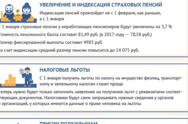 В январе 2018 года вступают в силу законы и постановления, касающиеся увеличения и индексации страховых пенсий, налоговых льгот, выплат при рождении первого ребенка, повышения акцизов и т. д.