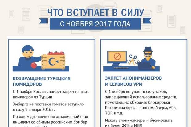 С 1 ноября вступают в силу поправки в Федеральный закон № 276 «О внесении изменений в закон "Об информации, информационных технологиях и о защите информации"». Теперь россияне не смогут в полной мере использовать анонимайзеры, VPN, Tor и другие инструменты для обхода блокировок запрещенных страниц. Под запрет попадет не деятельность самих компаний, а возможность через них обращаться к запрещенным ресурсам. Воздействовать на них, судя по всему, власти будут напрямую путем переговоров или через провайдеров, которых обяжут предоставлять данные о владельцах анонимайзеров.