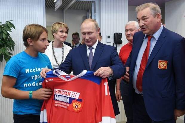 Путин сделал совместное фото с участниками семинара и пожелал им успехов. Спортсмены подарили главе государства хоккейную форму с логотипом «Красной машины».
